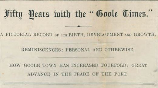 Local newspaper The Goole Times, launched in 1853,  celebrated its first 50 years of existence in1903 by issuing a special edition which it called the Jubilee Supplement. It was presented with the Goole Times issued on Friday 14 August, 1903. Unlike the modern Goole Times which is printed today in tabloid form, in 1903 the newspaper was printed in broadsheet format. The six pages of the supplement  measured 440mm x 565mm which make it quite a handful to manage.